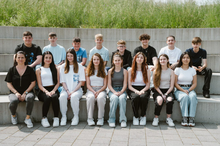 Die Klasse 9b: vl. Lara S., Leandra R., Lynn P., Laura B., Vivien B., Alicia G., Raquel M., Melina W., Janis Z., Beni Koch (Klassenlehrer)Mika G., Lukas S., Jessica D., Romina S., Ruben F., Simone D., Jamie K.Désirée Wanner: Herzlichen Dank, dass ihr euch während des Unterrichts für mich Zeit genommen habt, und viel Erfolg für die Zukunft!