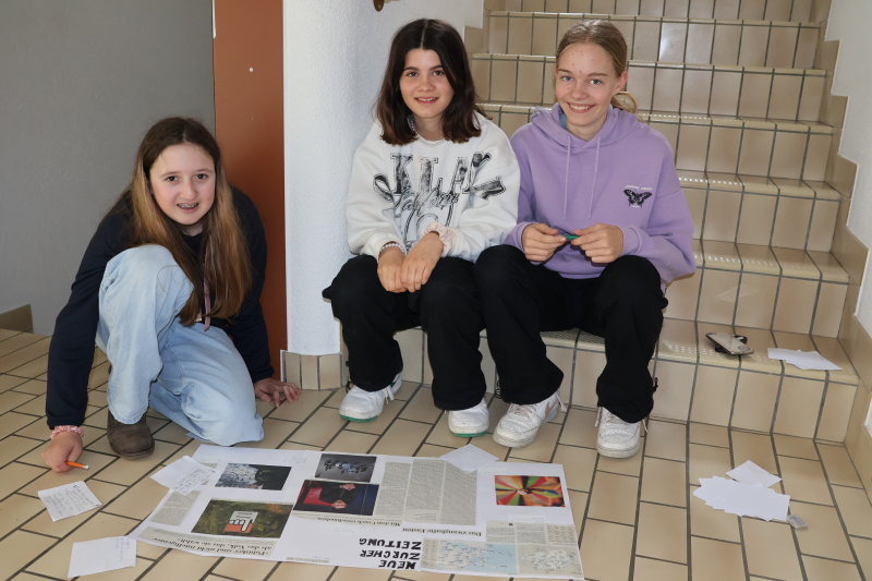 Drei Schülerinnen sitzen im Treppenhaus und diskutieren fokussiert über die bevorstehende Präsentation im Fach Deutsch. Sie sind intensiv bei der Erarbeitung ihres Zeitungsprojekts an der Arbeit. Die Funktionsweise von Medien will verstanden werden, das nützt auch später im Leben. Sie sind sofort für ein Foto zu haben, später gibt auch ihre Klassenlehrerin das Einverständnis.
