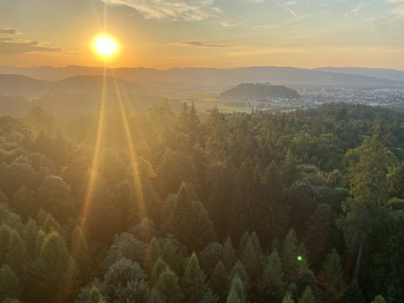 Die fünfstündige Wanderung bot den Teilnehmer:innen zahlreiche Highlights und faszinierende Einblicke in das Ökosystem Wald. Der Waldführer Martin Strahm erklärte auf den informativen Stopps anschaulich, wie der Wald, seine Baumgemeinschaften und die Organismen als faszinierendes System funktionieren. Die Teilnehmer:innen erkundeten mit einer Lupe das «Wood Wide Web», lauschten am Ufer des Aabachs mithilfe von modernster Technologie den Klängen der Pflanzen und erfrischten sich mit selbst gemachtem Weisstannen-Eistee. Ein weiterer Höhepunkt war der Sonnenuntergang auf dem Esterliturm, der eine beeindruckende Aussicht bot.