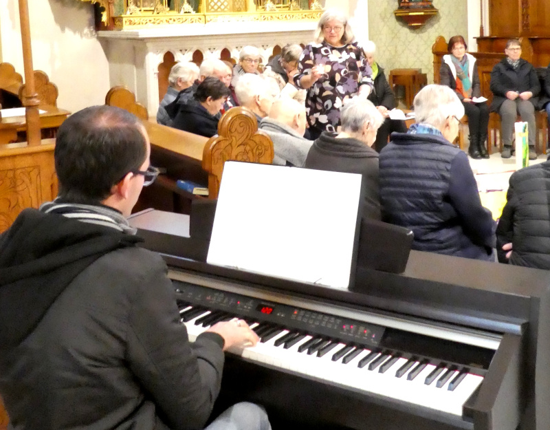 In Hildisrieden hielten sich die im Kreis sitzenden Gottesdienstteilnehmer:innen an einem Band fest und knüpften ein persönliches Stoffbändeli daran. Die Mitarbeiterinnen des Frauenbundes, Susanne Messerli und Hanny Duss, nannten dieses Symbol das Band des Friedens, das die Anwesenden in der Vorstellung mit den Palästinenserinnen in Verbindung brachte: «Der Frieden ist das Band, das euch alle zusammenhält.» Die Sakristanin, Elisabeth Imfeld, trug verschiedene, sehr passende Texte vor. Am Schluss wurde das Band innerhalb des Kreises auf den Boden gelegt. Jeder und jede Anwesende notierte auf einem Olivenblatt einen Gedanken oder eine Bitte, legte es neben ein Kerzlein auf das Band. «Friede wünsch ich dir und Friede wünsch ich mir, Friede mit eus allne und mit der ganze Wält», in diesem Lied unterstützte Andreas Wüest mit dem E-Piano den Gesang der Anwesenden. Das Zusammengehörigkeitsgefühl wurde in einer Kaffeerunde im Pfarreizentrum noch mehr gestärkt.