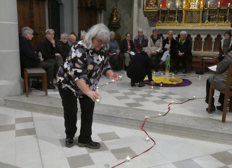 Susanne Messerli, pfarreiliche Beauftragte des Frauenbundes, legt die Kerzchen für die Anwesenden in den Kirchenbänken auf das Band.