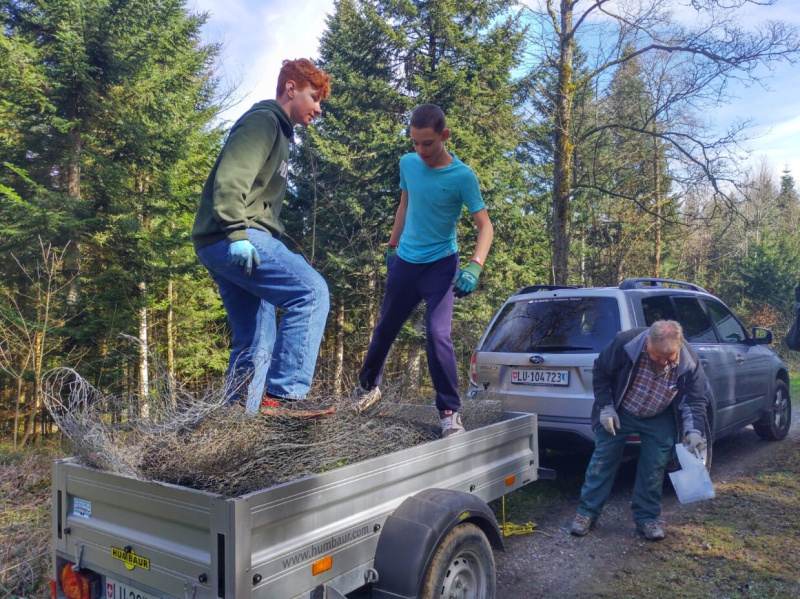 Während eine Gruppe im Wald arbeitete, engagierten sich die anderen Sekundarschülerinnen und -schüler im Rahmen des Clean-Up-Days, um die Strassenränder rund um Rickenbach von Müll zu befreien, der in die Felder geworfen worden war. Schnell entwickelte sich aus dem Sammeln ein Wettbewerb, bei dem die Schüler versuchten, möglichst viel und möglichst spektakulären Abfall zu finden. So wurden zahlreiche Zigarettenstummel, Dosen, PET- und Glasflaschen sowie ungewöhnliche Fundstücke wie Scheibenwischer, Strohsterne und Teile von Schlitten eingesammelt. Einige Autofahrer, die die Aktion beobachteten, hielten an und lobten die Arbeit der Schülerinnen und Schüler, was zu grosser Zufriedenheit über die geleistete Arbeit führte. An dieser Stelle ein herzliches Dankeschön für die gelungene Zusammenarbeit mit den vielen beteiligten Organisationen an diesem lehrreichen und arbeitsreichen Tag.