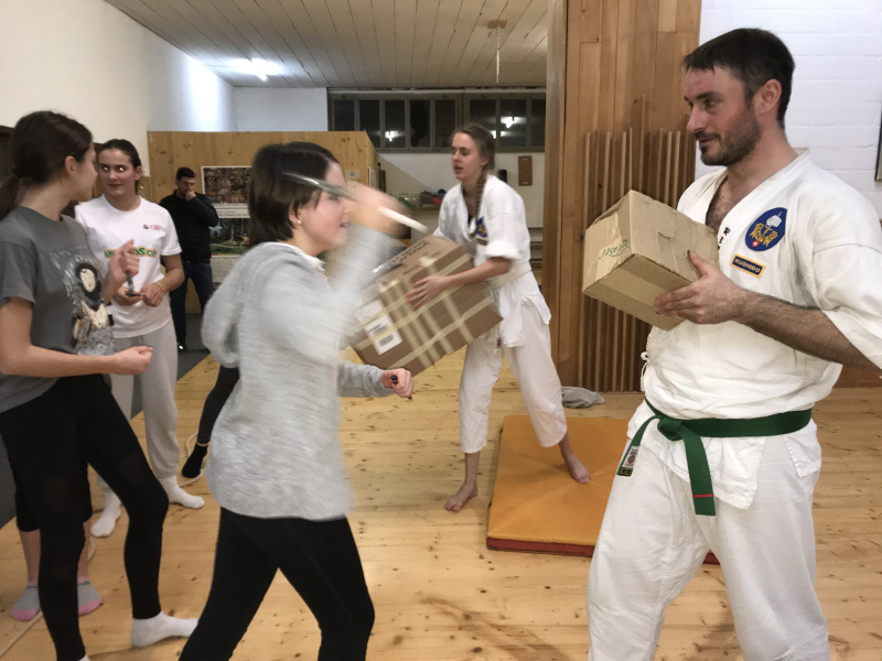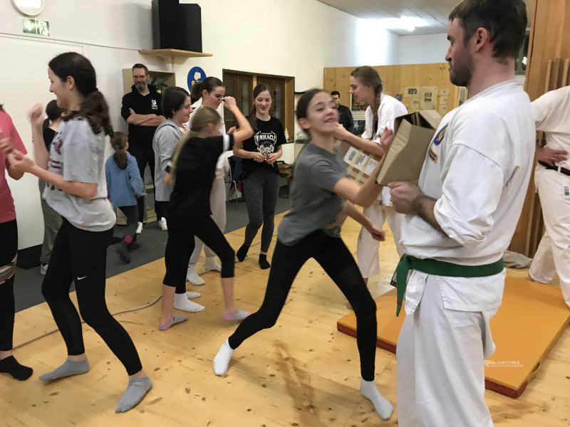 Am letzten Kursabend galt es ernst. Die Jugendlichen wurden von freiwilligen Eltern nach Hochdorf gefahren, dort wurde zum Abschluss ein Training mit erfahrenen, erwachsenen Trainingspartnern durchgeführt, welche in diesem Dojo regelmässig Karate trainieren. Dies war ein besonderes Highlight, denn da hatten die Mädchen die Möglichkeit, das Gelernte anzuwenden und ihre Fähigkeiten in einem realistischeren Umfeld zu testen.