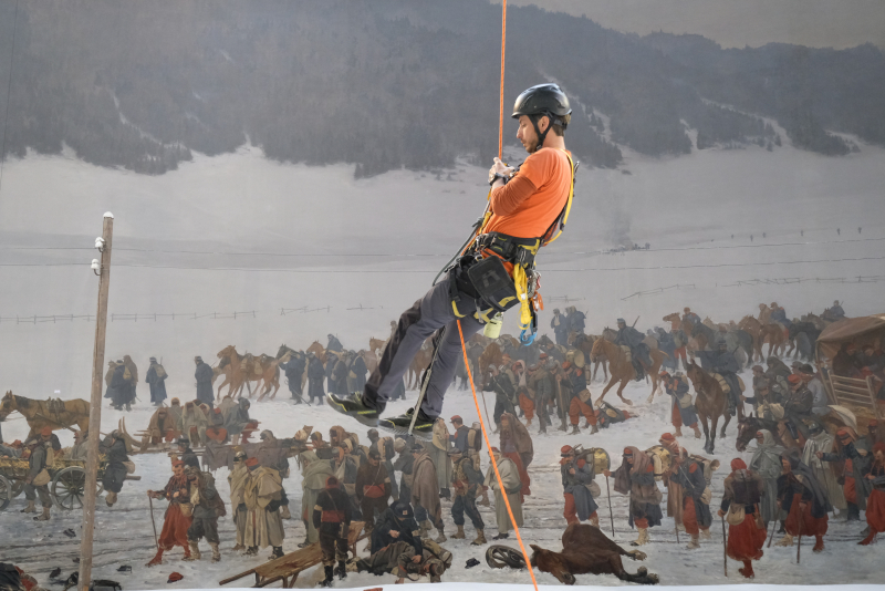153 Jahre ist es her, heute eine unglaubliche Szenerie: Tiefer Winter, Tausende erschöpfte Menschen, daneben halbtote Pferde im Schnee und haufenweise deponierte Waffen. So wird die Internierung der Bourbaki-Armee in der Schweiz im Jahr 1871 dargestellt auf dem anschaulichen 360-Grad-Rundbild, dem Bourbaki Panorama in Luzern. Sein Baldachin sowie das Beleuchtungssystem wurden Anfang dieses Jahres restauriert. Industriekletterer Laurent Lavignac war mit seinem Team beteiligt und gelangte an Orte, wo sonst keiner hinkommt.