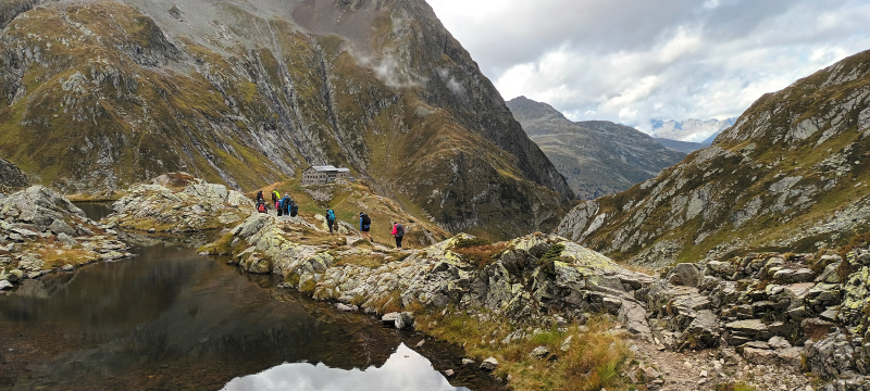 Der weitere Aufstieg erfolgte über den Crap la Crusch zur Terrihütte. Immer wieder liess ein Wolkenfenster die Sicht auf die herbstliche Farbenpracht und die atemberaubende Bergwelt der Greina-Ebene zu. Nach einer rund fünfstündigen Tageswanderzeit erreichte die Gruppe die Terrihütte über eine Hängebrücke, die 2018 erbaut worden war. Jedes Gruppenmitglied meisterte das Tagesziel souverän. In der Stube der vollbesetzten Hütte vergass man in gemütlicher Runde die Strapazen des Tages schnell und genoss schliesslich ein reichhaltiges, feines Nachtessen.