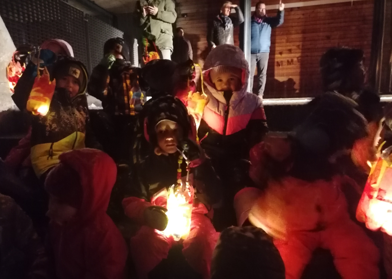 Die Leiterinnen basteln jeweils zusammen mit den Kindern eine schöne und individuelle Laterne, mit der dann alle beim Chlauseinzug teilnehmen. Am Freitag, 1. Dezember, war es dann wieder so weit! Die gesamte Schule Neudorf, die Spielgruppe und Trychler holten den Samichlaus mit Diener und Schmutzli im Wapfgrund ab. Dieses Jahr war der Samichlaus wieder in Begleitung von zwei Eseln, was die Kinder sehr freute. Zusammen zogen alle durchs Dorf zum Schulhaus. Dort waren vor dem Pavillon ein Sessel und Laternen für den Samichlaus vorbereitet. Das Wetter mit dem Schnee war passend – wie aus dem Bilderbuch.