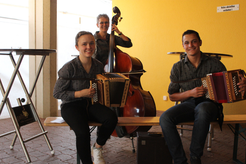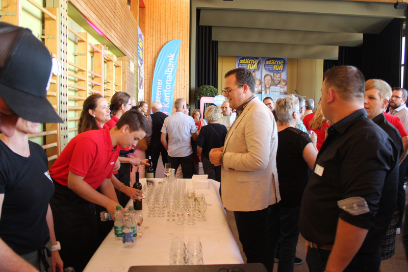 Am Samstagnachmittag kommt nun richtig Fahrt auf: Die Neugier zündet und das Areal füllt sich mit kontaktfreudigem Volk. Mehr und mehr gwundrig Interessierte finden sich ein. Auch die Lindenhalle ist jetzt gefüllt und der Service ist in vollem Gange. An den über 55 Ständen herrscht freudiges Kontakteknüpfen, und die Gewerbler haben nun alle Hände voll zu tun: Geknabber anbieten, Getränke ausschenken, zum Wettbewerb animieren, Goodies verschenken. Der Geräuschpegel steigt. Man führt lockere Fachgespräche oder einfach einen Schwatz, es wird angestossen, geplaudert und viel gelacht. Die Tische und Theken ziehen magnetisch die Leute an, die gerne etwas naschen, gucken oder schätzen. Alles wird ausprobiert! Manche gehen einfach lächelnd vorbei. Ein Jazz Trio kursiert durch die Gänge und bringt Schwung auf, wo noch keiner ist, und über die Lautsprecher vernimmt man die nächsten Highlights: «Als Nächstes das Konzert in der Lindenhalle...» Also, nichts verpassen! Für viele Standbetreiber heisst es jetzt auch: Schichtwechsel. Der Tag ist noch lang.