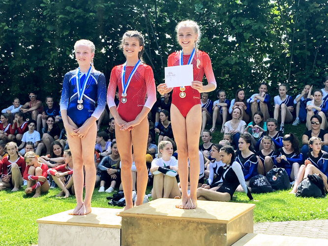Unsere Podestturnerinnen in der Kategorie 4 und 5 vlnr. Lynn Estermann (Gold K5) Ena Erni (Bronze K5) Aurea Cossar (Silber K4) und Livia Lötscher (Gold K4).