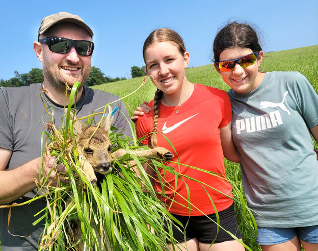 Tina und Joana haben das Kitz gefunden.Der Jäger nahm die Kitze behutsam mit einem Grasbüschel auf, so klein wie gerade mal eine Handvoll, verpasste ihnen eine Ohrenmarke und legte sie dann geschützt an den Waldrand, wo sie von der Mutter unversehrt wieder aufgefunden werden konnten. Rehkitze haben keinen Eigengeruch, damit Feinde sie nicht wittern können. Nähmen sie den Geruch eines Menschen an, würde die Mutter nicht mehr nach ihnen schauen und sie würden verhungern. Extrem schöner Moment«Es hat bei uns viele Rehe im…