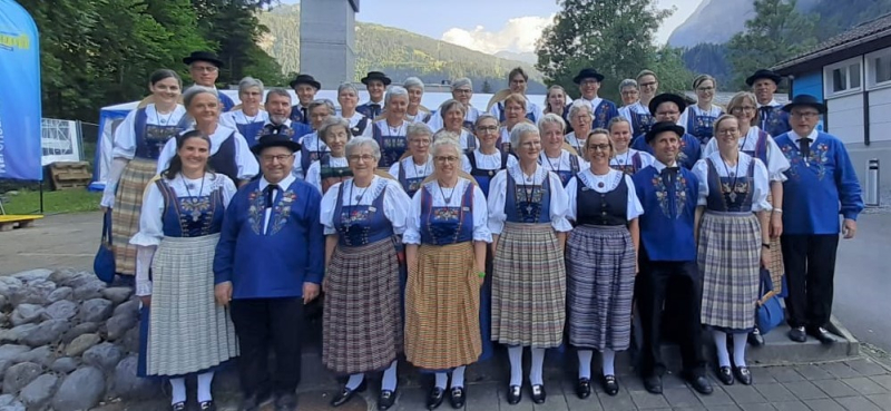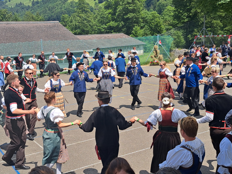 Bei hohen Temperaturen und vor einem herrlichen Bergpanorama trafen sich nach dem Mittag über 850 Tänzer:innen mit ihren verschiedenen Trachten zu einer eindrücklichen Polonaise. An dieser nahmen die mitgereisten Gunzwiler Tänzer:innen ebenfalls teil. Die Sänger:innen sangen beim Innerschweizer Chor mit und umrahmten unter anderem den Tanz «Hobbysenn», einen der vielen gemeinsam aufgeführten Tänze.