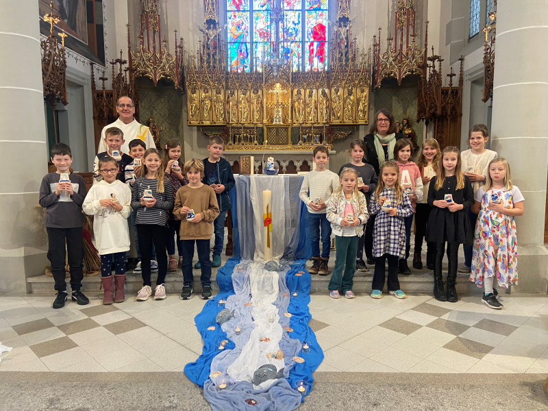 Am Sonntagmorgen versammelten sich die 17 Erstkommunionkinder mit ihren Familien zusammen mit den anderen Kirchgänger:innen zum Sonntagsgottesdienst. Die Kinder gestalteten mit ihrer Religionslehrerin Regula Soom den Gottesdienst vom Anfang bis zum Schluss aktiv mit. Sie lasen Gebete und beteten die Fürbitten. Alles stand unter dem Thema der Erstkommunion «Wasser isch choschtbar und chraftvoll, wie d’Fründschaft met Jesus». Der Bibeltext von der Frau am Jakobsbrunnen sagt aus, dass Jesus uns nicht nur das Wasser für den Leib schenkt, sondern auch das Wasser, das unseren innersten und tiefsten Durst nach Liebe, Geborgenheit und Leben stillen kann.