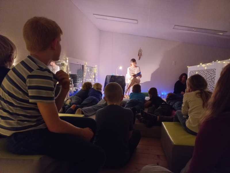 Alle Kinder der 4.–6. Klasse durften bei gemütlicher Sternen- und Schummerlicht-Atmosphäre eintauchen in zwei Bücher zum diesjährigen Thema «Traumwelten». Melanie Steinmann nahm sie mit auf die aufregende Reise «Der Traumspringer», verfasst von Alex Rühle.