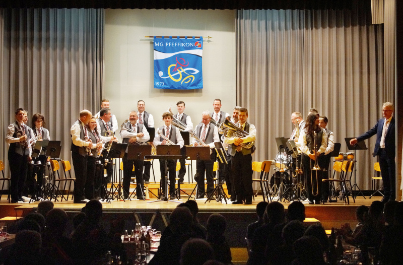 Bei seiner Ansprache blickte Präsident Roger Geissbühler auf die letzten eineinhalb Jahre zurück. Im Sommer 2020 war die Neuuniformierung mit Fahnenweihe geplant gewesen. Eine Durchführung war nicht möglich und auch das Ausweichdatum liess kein grosses Fest zu. So entschloss sich die MG Pfeffikon letztes Jahr im Dezember eine interne Feier mit Segnung der Uniform und Fahne vorzunehmen. Auch im 2021 war kein passender Event möglich. Somit konnte erst jetzt im Rahmen des Jahreskonzertes die neue Uniform an einem Konzert vorgestellt werden. Doch die verpassten Festivitäten werden nachgeholt: In eineinhalb Jahren, also anfangs Juli 2023 wird das 50-jährige Bestehen mit einem dreitägigen Dorffest gefeiert. Alles was jetzt zu kurz kam, wird dann nachgeholt. OK-Präsident ist Dirigent Herbert Waser, der bereits seit 16 Jahren den Taktstock bei der MG Pfeffikon schwingt. Dies zeigt, dass Herbert Waser nicht nur die MG Pfeffikon musikalisch leitet, sondern inzwischen eine tiefe Verbundenheit zu diesem Verein entwickelt hat. Deshalb gelingt es ihm auch immer wieder die gespielten Stücke auf seine Musizierenden abzustimmen. Und auch sein Dirigierstil ist unverkennbar: Mit tänzerischer Leichtigkeit und strahlendem Gesicht holt er sehr viel Spielfreude aus dem Orchester heraus.