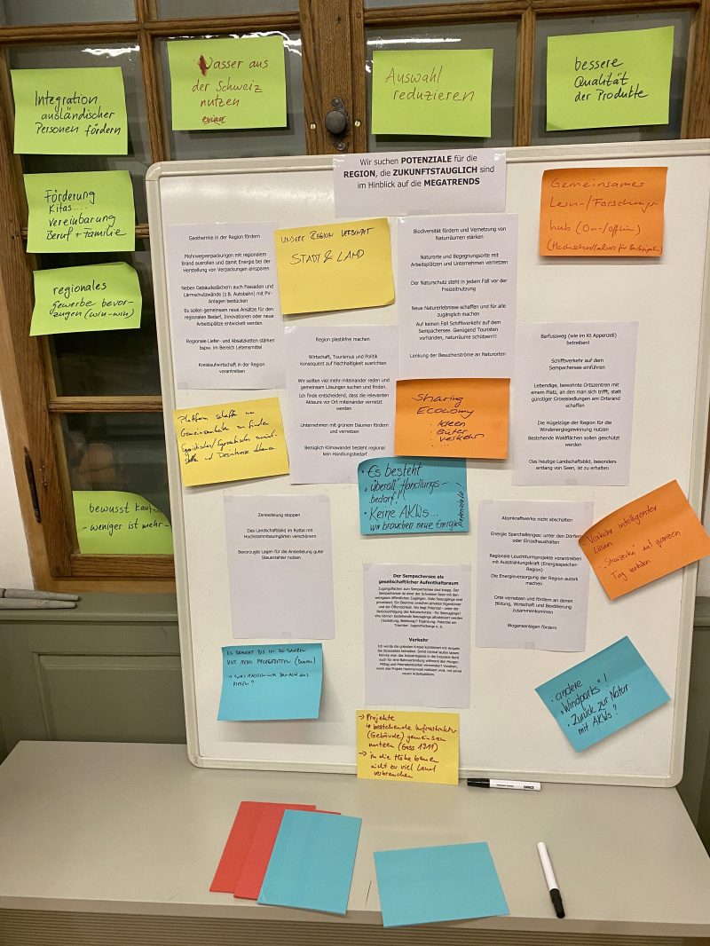 Gemeinsam wurden Zukunftsideen besprochen und skizziert, die auf den Megatrends aufbauen. Vorherrschende Themen waren Verkehrspolitik, Energiepolitik, Bildungspolitik und Gesellschaftspolitik. Ideen wie die Sharing Economy, Kreislaufwirtschaft und Vernetzung in allen Bereichen wurden angeregt und vertieft. Auch die Stadt/Land-Thematik wurde diskutiert. Konkrete Ideen waren etwa ein Barfussweg, Schiffsverkehr auf dem Sempachersee, Kita-Förderung und Nutzung von Geothermie und Windenergie. Naturgemäss oft mit plausiblen Gegenargumenten. Es sind nun bereits über 40 Ideen im Speicher für regionale Potentiale gesammelt, damit der Zukunftsprozess 2023 richtig in Schwung kommt.