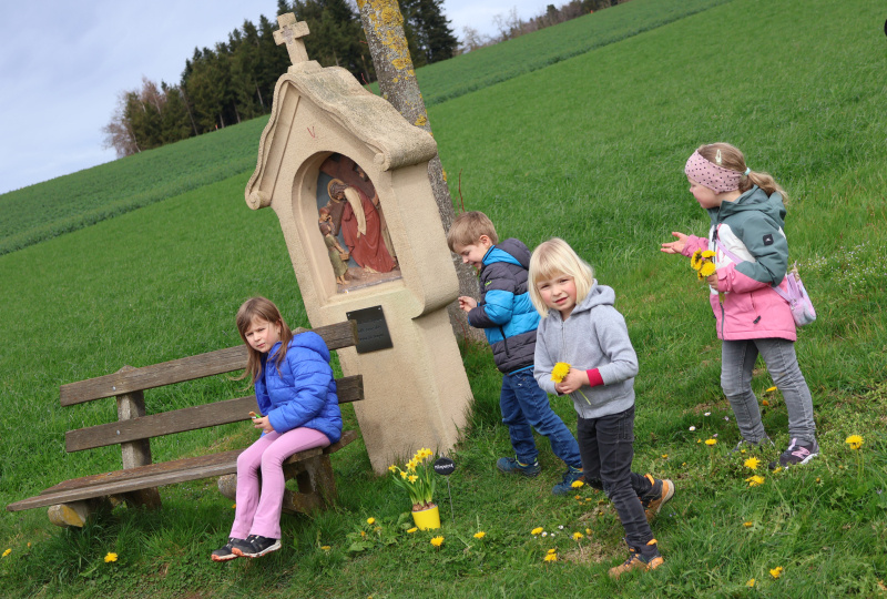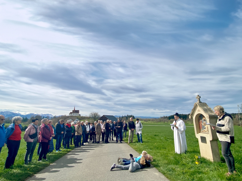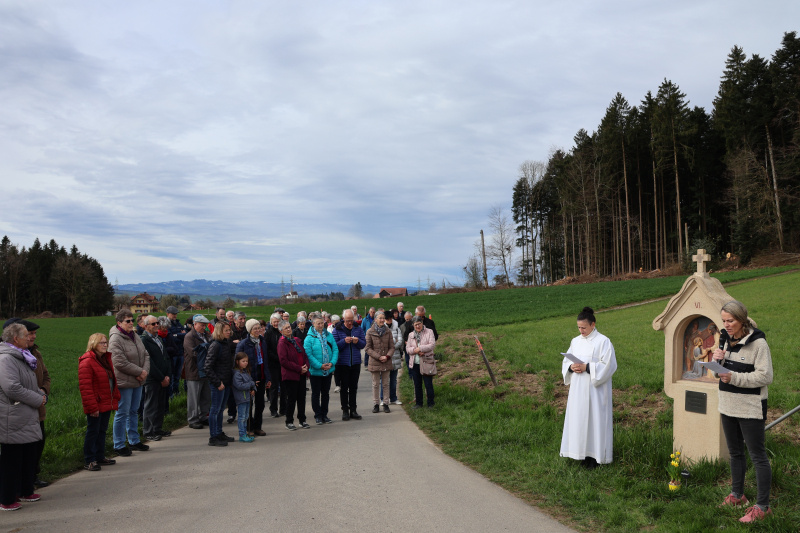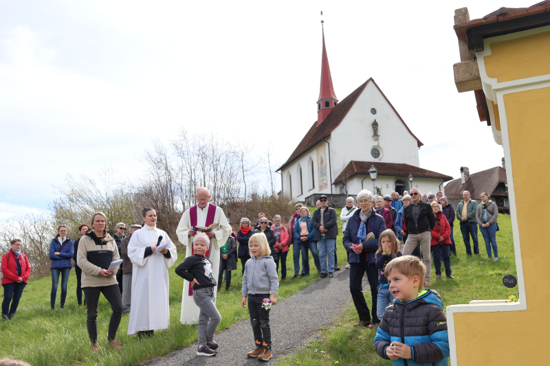 Nach einer kurzen Begrüssung in der Pfarrkirche Römerswil begaben sich die Teilnehmenden gemeinsam auf den Weg, um sich an die Leidensgeschichte Jesu zu erinnern. Die Pfarreiseelsorgerin von Römerswil, Veneranda Qerimi, und Katechetin Theres Galliker führten zur ersten Station, die symbolisch für alle Stationen mit Weihwasser gesegnet wurde. Zwischendurch sang man das Lied «Ubi caritas»: «Wo Liebe ist, da wohnt Gott ...» Der Weg führte weiter durch die schöne Landschaft bis zur Wallfahrtskapelle Maria Mitleiden Gormund. Bei jeder der 14 Stationen wurde innegehalten und aufmerksam den Worten von Veneranda Qerimi und Theres Galliker gelauscht. Bei der letzten Station, die vor der Kapelle Gormund am steilen Hügel steht, empfing Pfarrer Bühlmann die Gruppe. Er segnete auch diese letzte Station des Weges, bevor es zum Abschluss in die Kapelle ging.
