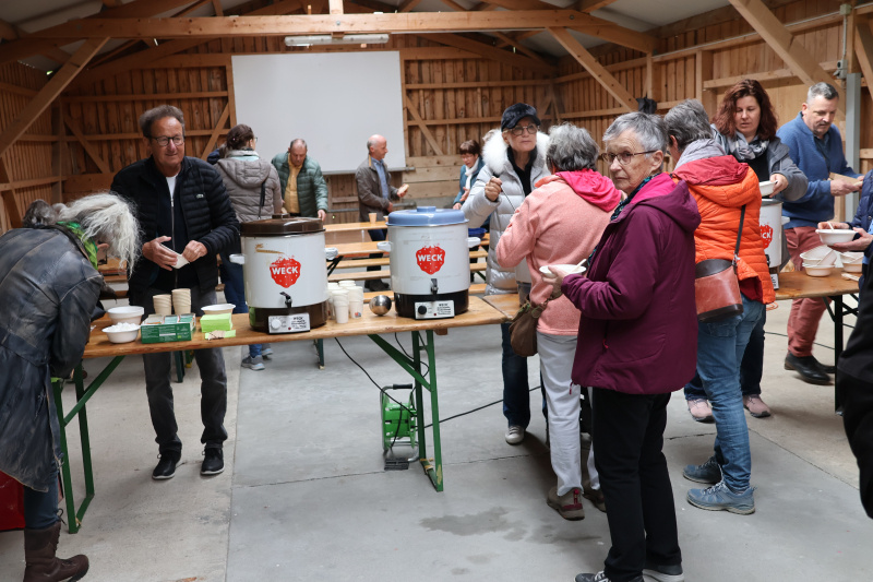 Im Anschluss an die Prozession genossen die Teilnehmer eine feine Gerstensuppe mit Brot und Tee. Da die Organisatoren mit etwa 70 Pilgern gerechnet hatten und 120 kamen, musste die Suppe ein wenig gestreckt werden. Währschaft genug war sie jedoch alleweil, und genug für alle hatte es auch. Dabei liess man sich von der warmen Frühlingssonne verwöhnen und nutzte die Gelegenheit für wertvolle Begegnungen und Gespräche.