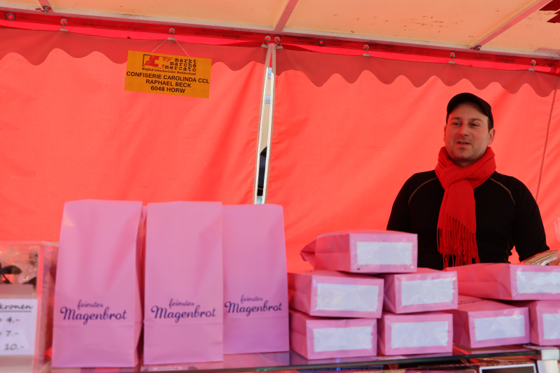 Marktchef Alfons Röthlin geht zwischen roten und gelben Marktständen den Flecken auf und ab. Er hat den Überblick und ein zufriedenes Lächeln im Gesicht. «Aufgestellte Marktfahrer und Wetterglück ‘bis änenuse’», strahlt er, «es läuft wirklich!»