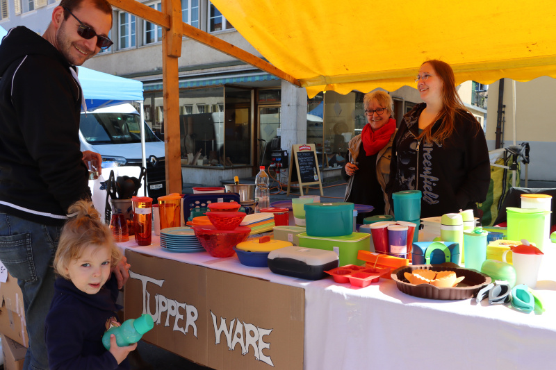 Dinge, die es in keinen Läden gibt, lassen sich am Frühlingsmarkt erstehen. So auch die farbenprächtige Auslage am Tupperware-Stand von Familie Küng. Alles Neuware. Wer nichts kauft ist selber schuld.