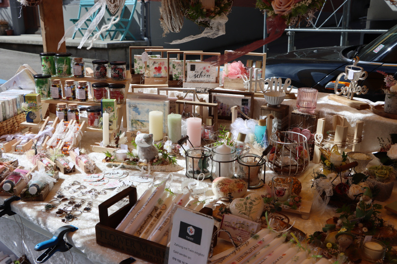 Diese Entsprechung für Buchstaben E liefert Raphi, Standbegleiter von Marina Gassmann. Sie bietet hübsche Floristik-Dekorationen an, und recht hat er: mit ausgewählten Artikeln kann man sich und andern eine Freude bereiten.