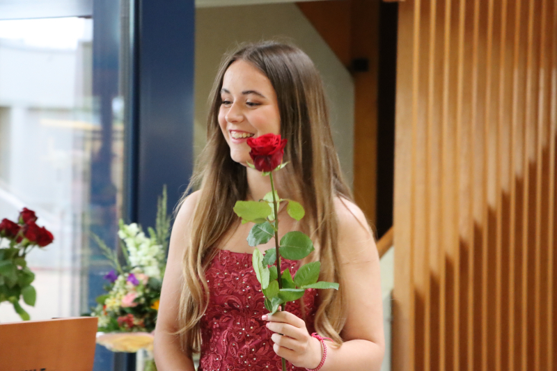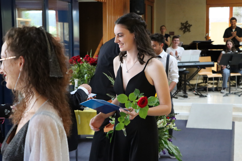 Nun war es an der Zeit, die Maturazeugnisse an jeden und jede der drei Klassen zu übergeben. Von 57 Kandidat:innen, die an die Maturaprüfungen angetreten sind, haben 56 die Prüfung bestanden. Fabienne Andermatt vom Verein der Ehemaligen der KSB übergab die drei Don-Bosco-Maturapreise an Zoe Brun, Beromünster und Larissa Krummenacher, Rain (je 5.50) und im 1. Rang an Salome Ehrler, Sempach (5.57). Wahrlich herausragende Leistungen. Jede und jeder erhielt aus den Händen von Gemeindepräsident Hans-Peter Arnold ein edles Schreibset für das analoge Schreiben. Laurenz Pirchl bot einen eigens geschriebenen Song, «KSBye», der durchaus melancholisch war, doch gegen Schluss Temperament zeigte, so wie die Jungen nun ins Leben rausgehen.