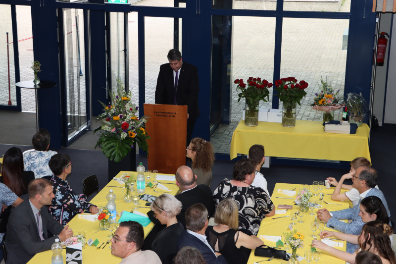 Rektor Marco Stössel konnte voller Freude die Maturandinnen und Maturanden mit ihren Eltern und den Lehrpersonen sowie Gäste aus Wirtschaft und Politik begrüssen. Das finale Ziel der Kantonsschule, die Maturität, war glücklich erreicht. Marco Stössel erwähnte, dass er mit diesem Jahrgang 2017 als Rektor gestartet sei, als auch für ihn vieles neu gewesen sei. Er sprach über sein Credo der Vertrauenskultur und appellierte an die zukünftigen Leader der Gesellschaft, Optimismus an den Tag zu legen, Vertrauen anzunehmen und zu schenken, ehrlich zu sein und sonst lieber zu schweigen. Er betonte, dass seine Gedanken auch diesmal ohne jeden Einbezug von KI entstanden seien.