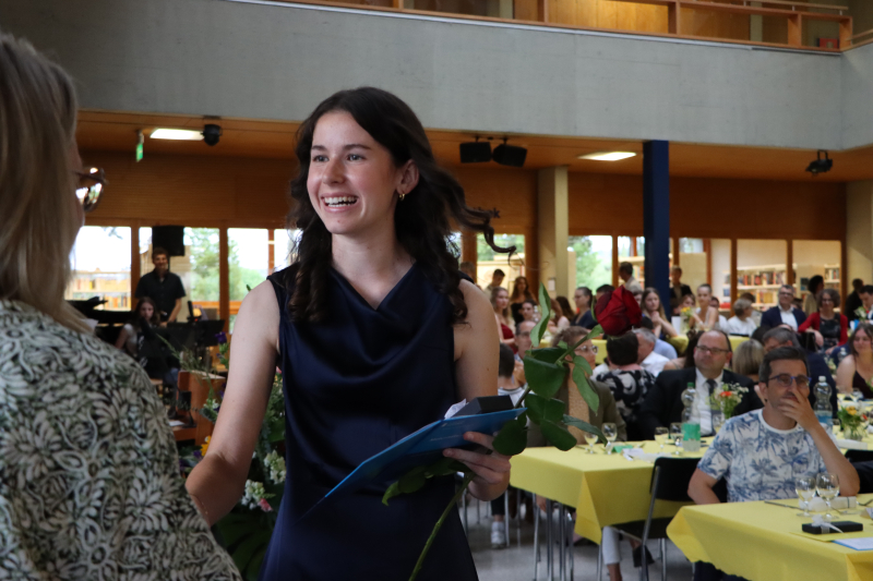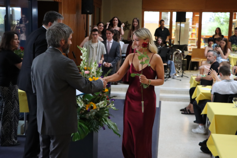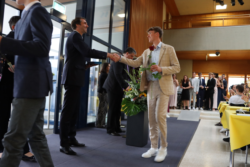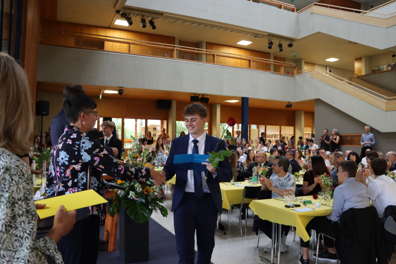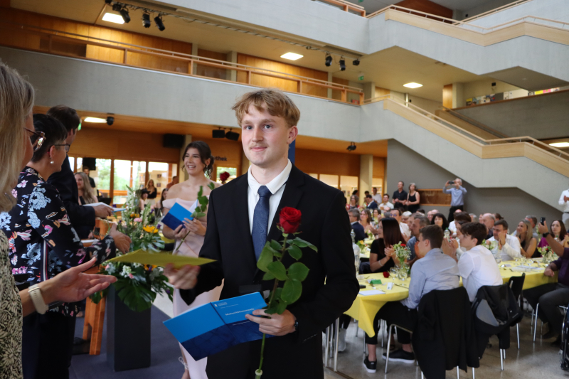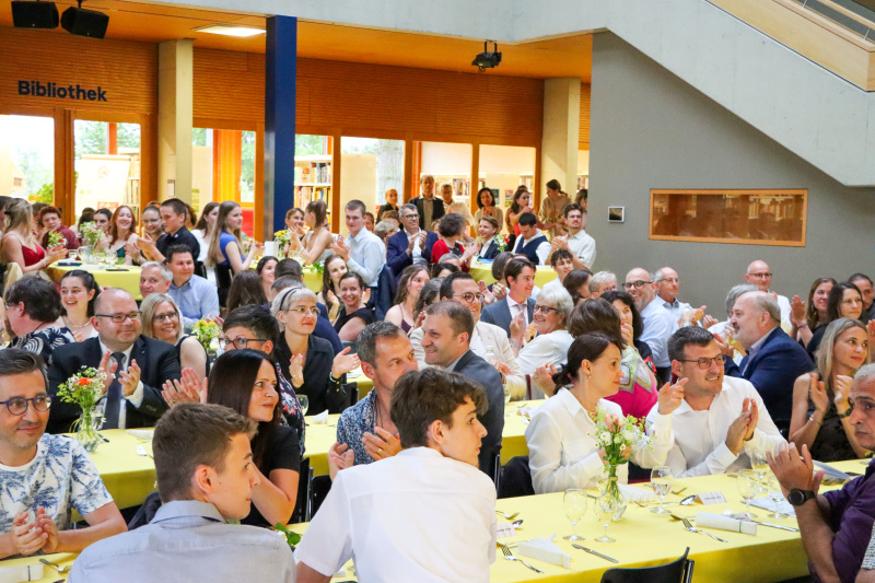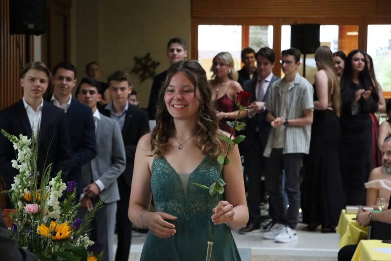 Anschliessend servierten die Schüler:innen der 5. Klassen gekonnt ein feines Nachtessen. Zwischen Hauptgang und Dessert glänzte der Gewinner von «Jugend debattiert», Linus Kerngast, mit einem rhetorisch perfekt vorgetragenen Rückblick à la Harry Potter auf 6 Jahre Kanti Beromünster. Man habe nicht nur gezaubert, sondern sich «6 Jahre durchgemogelt». Er verriet einige Highlights der schrägsten Begebenheiten, wobei irgendwo ein Gentleman's Agreement zu spüren war, dass man nicht allzu fest austeilt. Für seine rhetorische Leistung gratulierten ihm einige im Saal persönlich.