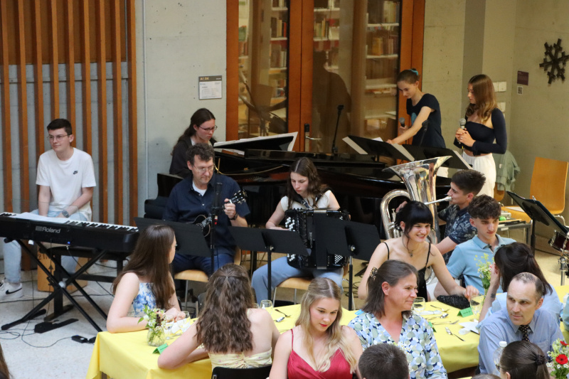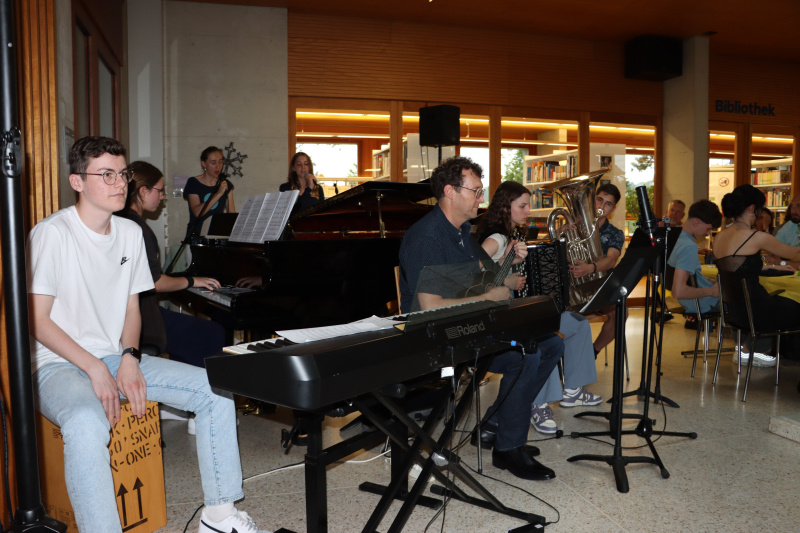 Lena Lustenberger, Laurenz Pirchl und Noah Böbner eröffneten den Abend mit ihrem tollen Mashup aus grossen Songs. Sie starteten mit U2's «Still Haven't Found What I'm Looking For» und schlossen das Set ab mit der Abwandlung «And Now We Have Found...» Auch «Don't Stop Me Now» war programmatisch. Auch Marco Stössel meinte nach dem Mashup begeistert: «Sie haben den halben Lehrplan Musik zusammengefasst und mehr Instrumente haben wir nicht...» Auch die weiteren musikalischen Darbietungen von Fiona Flury, Lena Lustenberger, Clara Steiger und Lisa Estermann waren hochklassig und spannten stilistisch einen weiten Bogen.