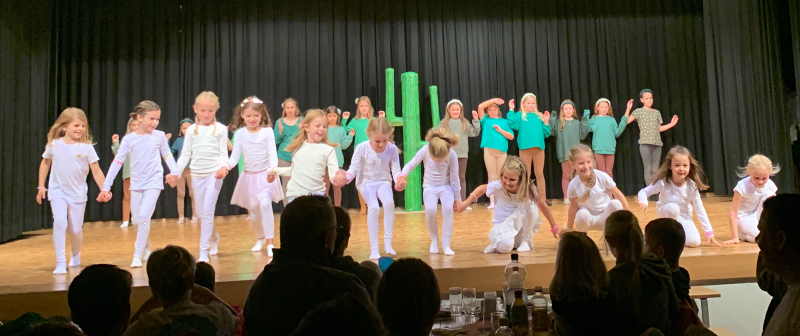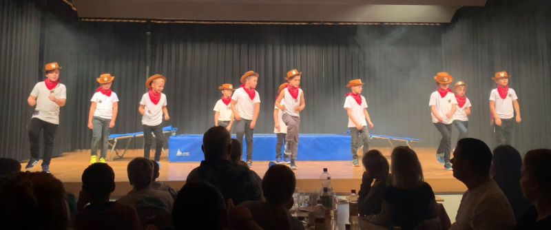 Total machten an der Turnshow sieben Riegen mit. Die Kleinsten, die Mädchenriege, eröffneten die Show mit ihrem Tanz. Die einen waren als Kakteen unterwegs, die anderen ganz in Weiss gekleidet, was dann mit dem Schwarzlicht super aussah. Man sah den Mädchen ihre Freude an. Danach kamen die aktiven Damen mit «Powwow». Die Indianerinnen zeigten ihr Können mit einem synchronen Tanz. Zwischen den Riegen kamen immer wieder Sketches von Winnetou und Ranger, welche sich immer noch auf der Suche nach dem Schatz befanden. Nach den tanzenden Indianerinnen kam die Jugi an die Reihe. Sie zeigten dem Publikum Sprünge auf dem Trampolin. Ebenfalls wurde auch hier wieder das Schwarzlicht eingesetzt, und machte das Ganze zu einer coolen Show. Danach kam bereits die Männerriege an die Reihe. Auch diese Cowboys zeigten, dass sie sich zum Takt der Musik bewegen können. Im Saloon gab es dann sogar noch eine kleine Schlägerei in Zeitlupe.