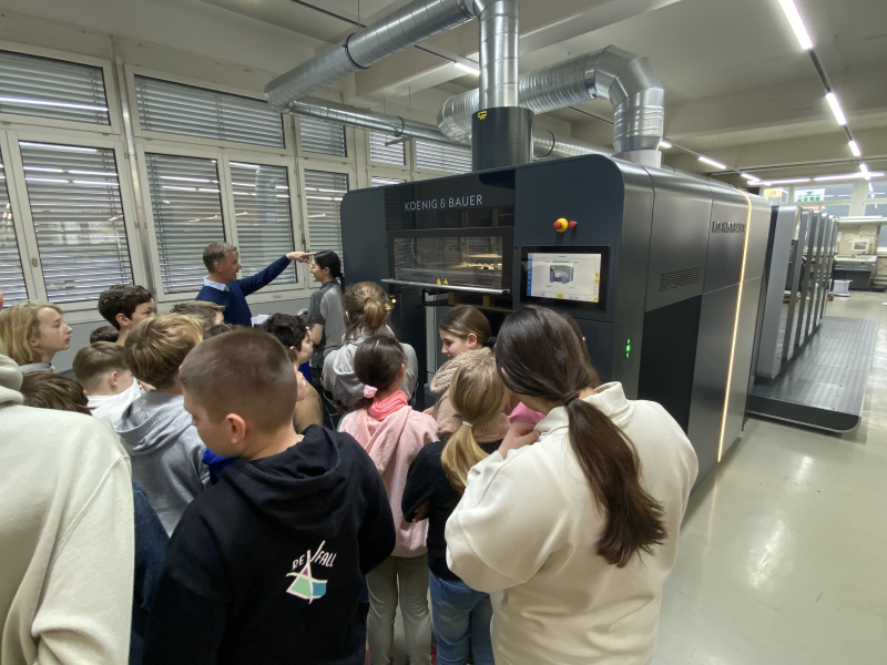 Beim Betreten der Druckerhalle schlugen die Herzen der jungen Tüftler und Techniker ein bisschen höher. Vor ihren Augen erstreckte sich das neue Herzstück der Druckerei: die nigelnagelneue Druckmaschine.
