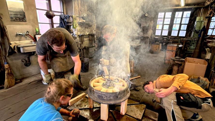 Der Reifen wird in der Esse gewendet, (v.l.) Michael Aeschimann, Michel Güntert und Maurin Gmünder (hinten). Das Holzrad lag auf daneben bereit. Dessen Holzteile hatten eine wenige Millimeter grosse Fuge, die später von erkaltendem Metall zusammengezogen wurde. Wagner wie auch Schmied stützen sich dabei zum einen auf Berechnungswerte, aber die…