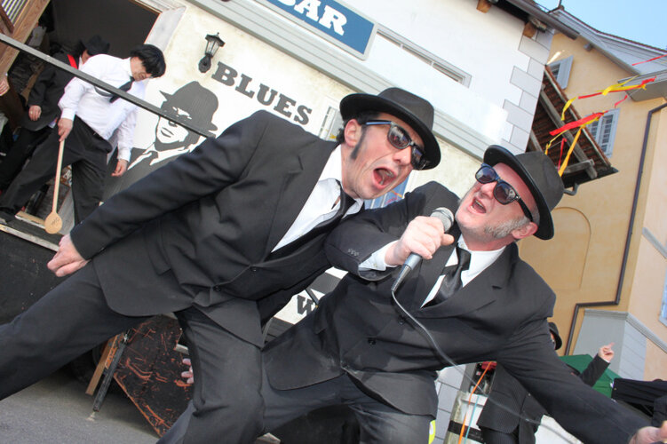 The Blues Brothers are back ... und die Chommerbuebe kümmerts nicht, ob ein Umzug stattfindet oder nicht - bei ihnen geht die Show ab! Sie haben am Sonntag ihren Mini-Umzug zelebriert, die Platzhirsche im Schlepptau: vom Reitplatz zur Enoteca, zwei Wagen, zwei Nummern - Stimmung grandios.
